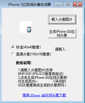 iPhoneQQ在线头像生成器是一款qq装逼小工具,相信大家都知道,iPhoneqq在线时和安卓的不一样,现在使用iPhoneQQ在线头像生成器,就可以让别人看着你的qq也是iPhone在线,喜欢的朋友欢迎下载使用。