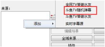 按照上面的步骤安装好插件后,启动OBS, 然后在OBS主界面的“来源”列表窗口里面点鼠标的右键,然后点击弹出来的“添加”,再在里面点击“斗鱼TV随机弹幕插件”添加这个源。