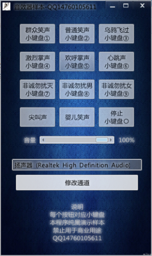 音效器样本是一款网上音频特效软件,这款软件可以模拟各种各样的声音,在各类网络直播间可以通过该软件进行音乐特效辅助,让你的直播不在单调。