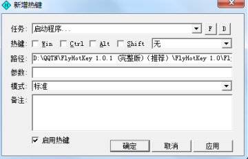 1.选择热键-新增,然后在任务中选择相应功能,选择热键,输入路径和参数,以及模式,确定即可。如果要连续添加热键,请单击应用,然后继续设置下一个热键