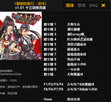 御姐玫瑰Z2混沌十三项修改器是作者风灵月影制作的一款游戏修改器,该修改器可以修改御姐玫瑰Z2混沌游戏中无限生命,满狂暴槽,最高连击等多种游戏熟悉,修改器能帮助我们更畅爽游戏,需要的朋友欢迎下载爽玩。