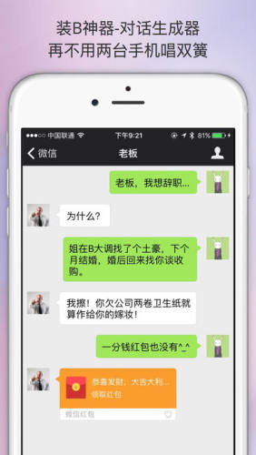 B大调装逼神器是一款非常流行的对话制作生成神器,从微信到支付宝,无所不能,只需要输入对话内容,便能自动生产聊天记录的图片,轻松而便捷。在软件里你可以自定义你的微信头像、名称、图片、内容和发布时间等等!生成任何你想要的效果。适合做微商的你,微信转账截图,微信交易聊天截图,钱包余额,还可以发朋友圈,充大款,吸引美女帅哥围观!