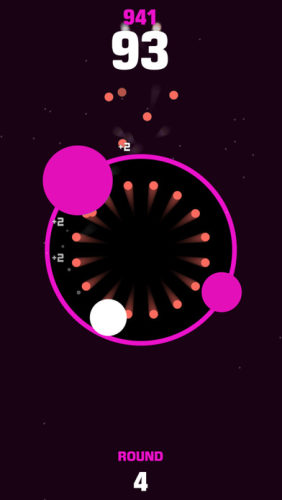 游戏开始以后球会围着圆环内围不停转动,此时能吃掉环内出现的小球,而之后会有大球从环外飞入其中,与小球同方向运动,不过如果被追赶上或者从上面被撞就会被吃掉,所以玩家要操控小球移动到另一边,只要点击就可以飞射出去,如果整个撞击在大球之上,则会打散大球并吃掉,接触被围攻的危机。而玩家要在没有尽头的循环之下,尽可能多的得到高分。