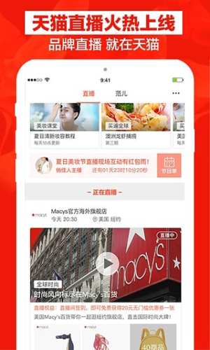 天猫手机客户端软件正式上线直播平台,海量天猫品牌入驻,为全球用户提供精彩纷呈的品牌直播;来自各位明星达人陪你一起挑选最满意的商品,用户通过天猫App,可以第一时间观看直播,抢红包!