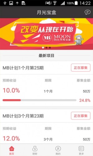 月光宝盒理财专注于p2p平台,相比线下理财具有多重优势,比如我们可以时刻关注我们的投资的资金的动态,不需要像线下那样来回跑,月光宝盒理财所有操作只需一部手机即可,并且我们保证安全无忧。