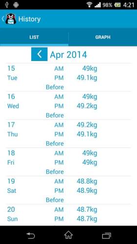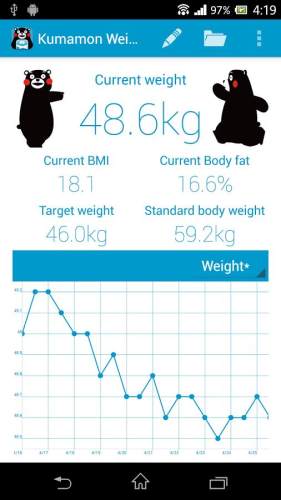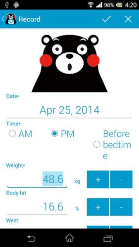 熊本熊体重管理Kumamon Weight 是一款安卓手机上的体重管理应用,早晨,晚上,我可以西睡前记录体重,身体脂肪百分比。
