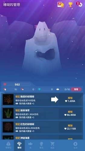 《深海水族馆》就是利用火山喷出的生命值购买不同的鱼类、珊瑚,放置在山的周围,放置的位置不能自定义。