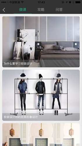 1、【快乐学吧】共分为三个模块:“微课”、“攻略”、“问答”。学习前人的经验心得,快速了解家居装饰不可不知的细节与常识,还有热门的问答环节,助你更加了解软装行业。