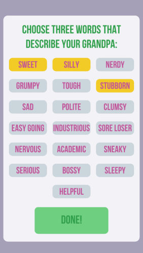 它具有它在播放过程中会影响光的对话爷爷的创造者,允许玩家创建自己选择的爷爷,并选择他们应该有什么样的个性(脾气暴躁,愚蠢的,甜的,等等)。