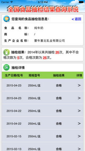 【便民】食安查提供直观、简洁、便于查询的界面,消费者可以通过三种方式进行查询:一是通过输入食品名称,快速找到其查询的食品抽检结果;二是通过选择食品分类,查询到食品的抽检结果;三是通过扫描商品条形码查询。