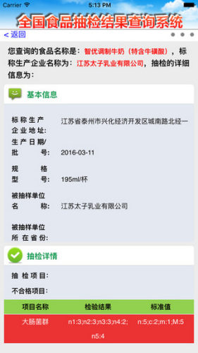 二是通过选择食品分类,查询到食品的抽检结果,例如:点击“乳制品”可列出该类产品的抽检结果;
