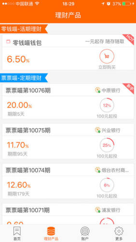 《票票喵个人版》是一款好用出色的个人理财应用,使用这款应用玩家能够轻松方便地查找到大量安全优质高收益的理财手段和理财计划,出色的方案和优秀的个人理财推送和推荐为您打造最强理财手段!