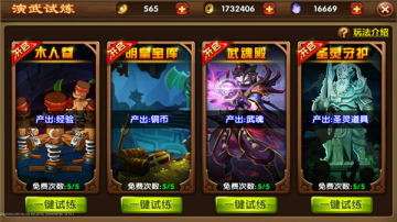 玩家达到20级,即可参与演武场,演武场分别有木人巷、明皇宝库、武魂殿和圣灵守护,每个不同的副本都有不同的玩法哦。