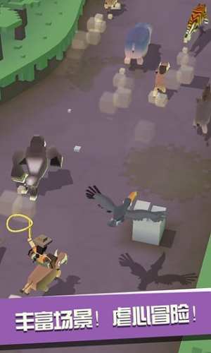 《疯狂动物园》是一款集3D像素、急速跑酷和模拟养成为一体的休闲小游戏。在游戏中你将扮演一名富有冒险精神的绝世牛仔。在高速移动的情况下与各种动物一较高下。你要尽可能多的套住动物,将它们统统带回飞船上的“空中动物园”中饲养;并进行园区升级,以便迎来世界各地的游客光临赚取更多金币。