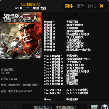 进击的巨人3dm修改器是一款由风灵月影原创制作的中文修改器。它包含无限瓦斯、武器无限耐久、无限经验、无限金钱、无限经验无限体力等二十二项功能的修改。让玩家体验更加轻松的游戏,需要的朋友赶快来下载吧!