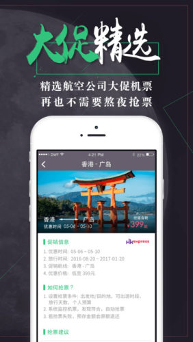 带我飞机票抢购iOS版是一款特价机票抢购软件,为用户带来全网最优价机票,通过海量航班数据分析,精选最特价机票,智能匹配性价比最高的航班,机器人全自动下单出票,让你的出行更省心。需要的朋友赶快来下载体验吧!