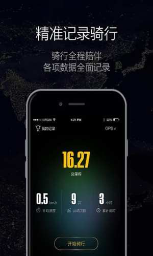 记录【骑行轨迹】:基于GPS定位技术和特有算法,追踪骑行轨迹;实时监测时速、配速、消耗卡路里及更多运动数据;历史记录,数据统计;在社交网络中与朋友们分享你的进步!