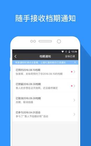 消息中心:有任何拍摄档期动态,都会收到通知提醒;