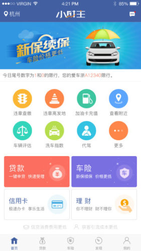 小财主,为广大汽车分期贷的用户提供还贷信息实时查询、车险信息及时提醒,避免信用受损;及尾号限行、违章查询、洗车指数、附近车位、车辆估值等有车服务,满足消费者日常用车需求。