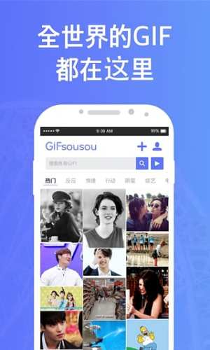 GIF搜搜分为:热门,反映,表情,动作,明星,影视,美女,韩国,动物,动漫,运动,艺术,美女时尚,食物餐饮等板块。