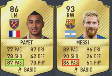 在15-16赛季的比赛中,助攻方面梅西以26-17战胜了帕耶,但场均送出威胁传球的数据上,帕耶又稍占上风。客观的说,游戏公司给出的这个数值评定,其实有一定的道理。