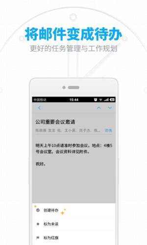 高效:一键设置邮件为待办事项,轻松管理工作任务。待办实时提醒,不错过每一个重要时刻。机票、酒店和账单邮件卡片式设计,重要信息一目了然。