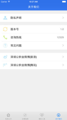 深圳市住房公积金App具有信息公开、办事指南、便民工具及互动咨询四大功能模块。帮助缴存职工随时了解深圳公积金中心发布的最新通知及最新政策、方便职工及时查询了解公积金提取、缴存、贷款业务的办理流程、提供公积金余额查询、业务办理网点查询、贷款计算器等使用频率较高的便民工具、并将公积金咨询热线12329与业务知识库相结合,为职工提供咨询投诉服务。