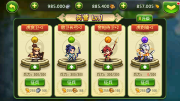 兵营是《无双兵团》的主要创新部分,是小兵产出的基地,也是提升主公实力的重要途径。升级兵营能够提高小兵的生产速度。在无双兵团中,小兵可以升级和进阶,升级会消耗兵草,进进阶消耗兵魂。进阶到一定程度外貌也会改变,变得更加炫酷。小兵有两种作战形态,特性不同根据需要可以在战斗中切换。小兵阵亡后需要征兵,消耗资源,因此升级兵营十分重要,对于后期主公在游戏中征战四方有极大的帮助。