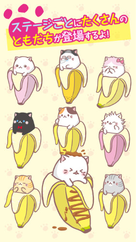 和动画版一样,《香蕉喵》手游其实也没有多少复杂内容,主要就是让大家玩个“萌”。游戏目标就是收集从天而降的甜品点心,用它们收集各个品种的香蕉喵,直到集齐图鉴为止。游戏为玩家们准备了三个关卡,所有种类的香蕉喵都可以通过闯那三关入手。首先要击碎画面上方漂浮的气球,让气球内藏着的点心落下。这样就能把喜欢点心的香蕉喵引来,然后让它们外出招来更多的同类朋友。如果成功了,就会进入下一关;而要是失败了的话……香蕉喵就会变成香蕉咯。