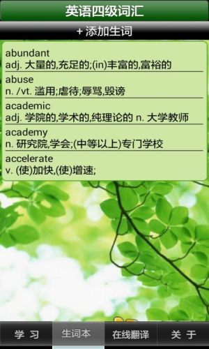 英语四级考试CET-4大学必考内容,考试时间为每年6月份和12月份,包括听力理解,阅读理解,翻译,写作几项内容,而单词量的多少就决定你理解多少,这里有6000多个四级词汇,轻松学习,轻松过四级。