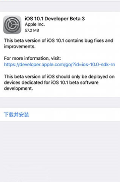iOS10.1开发者预览版Beta3可以由运行之前的开发者预览版的iPhone、iPad和iPod touch通过OTA在线升级,没有安装Beta版本设备的需要先首先通过Safari浏览器下载一个描述文件(点此下载),需要注意的是你要删除之前已经安装过的其它描述文件,然后按照提示安装描述文件并重启手机。