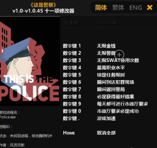 这是警察1.0.45修改器是一款适用于这是警察v1.0-v1.0.45版本的一款修改器工具,该修改器可以修改无限金钱,瞬间返回警局,瞬间到达犯罪现场等十一项功能,需要的朋友欢迎下载使用。