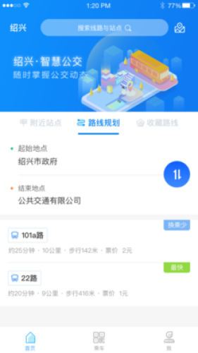 绍兴智慧公交app是让您在公交车上用手机就能与公交屏免费互动的社交软件,根据你的目的地为你合理规划线路,还有到站提醒等功能让你享受更便捷的服务!