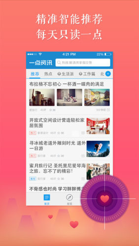一点资讯是一款为兴趣而生的新闻资讯App。来自硅谷的核心团队致力于为用户提供私人定制的精准新闻资讯,以提供个性化的自定义关键词、并伴以顶尖算法不断学习用户偏好的方式重新定义新闻客户端,帮助用户在日益爆发的信息洪流中快速捕捉最核心最需要的资讯。