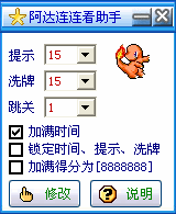 本软件为阿达【连连看3.0、3.1、3.2、3.3、3.X简体中文精装版】及【连连看3.0、3.1、3.2、3.3、3.X简体中文完全版】系列游戏的辅助工具,它可以帮助您轻松的完成连连看3游戏。本软件使用方法简单,容易操作。1、增加提示次数 2、增加洗牌次数 3、加满时间 4、直接跳到指定关卡 5、增加自动锁定时间、提示、洗牌功能……。