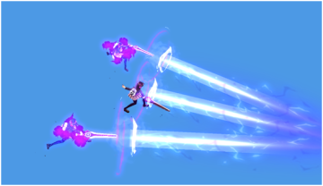 主角幻化出两个分身,并将雷霆之力积蓄与剑体内,向前方发射打击前方范围内的敌人。造成300%的雷霆伤害。