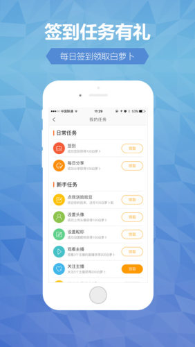 个人中心:集成了大量的人性化便利功能,随时关注主播,查看历史观看记录,打开关注主播列表。最最重要的,可以完成白萝卜任务,获得大量白萝卜哦。