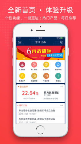 东北证券融e通手机证券,是东北证倾心打造的又一非现场交易方式,为投资者提供快速的证券行情、安全的交易、全面证券资讯、方便的银证转账等多种服务。市面多种品牌、多种机型全方位适配。真正做到让您随时随地进行快速投资理财。