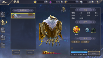属性界面,你可以了解灵兽的基础属性和所具有的武学技能,灵兽提升等级所需要的材料灵元,这里灵兽的等级不能超过玩家的等级;