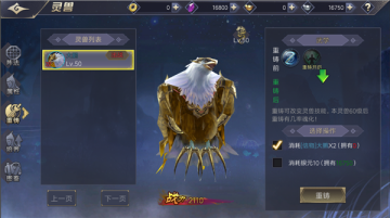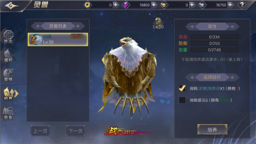 培养界面,就是通过消耗灵兽培养丹或银元来对灵兽进行攻击、防御、血量的培养,培养可能失败,当遇到培养到满意的属性时可以替换掉之前的属性,培养失败的话可以维持培养前的属性;