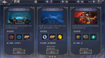 虚空之界(45级开放)是历练中三种玩法的一种休闲类的双人组队玩法,虚空之界是一个封闭的世界,玩家进入需要消耗12体力,每天能挑战三次,两个玩家需要在规定时间内合作击杀来犯的5波怪物,击杀怪物能获得经验和宝石的奖励,胜利后可以用银元来刷新晶石奖励,击杀的波数越多,奖励越丰富,是盛产晶石的一大玩法。