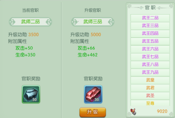 “官职”分为武宗,武尊,武王,武皇,武君,武圣,至尊六个层次。而武宗,武尊和武王都有一到十品。官职的升级需要“功勋”,当“功勋”达到官职的升级要求时就可以升级,并得到官职奖励。“功勋”可通过竞技场,荣耀远征和国战活动主要获得。