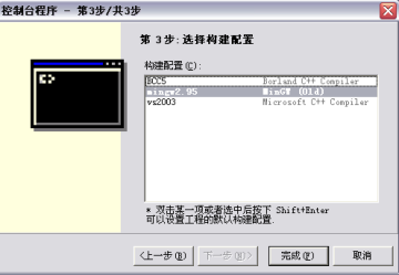 在上面的窗口中,选择工程类型为“控制台程序”,输入工程名称为“proj1”,然后点击“确定”按钮。这时会出现向导对话框,如下图所示: