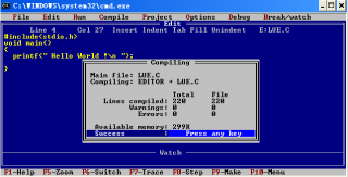 (5)退出Turbo C2.0集成开发环境。有两种退出Turbo C2.0集成开发环境的方法:一是同时按下ATL+X两个键退出集成开发环境。要再次进入集成开发环境必须再次执行TC.exe文件。二是选择主菜单“File项”中的“Os Shell”子菜单项退出集成开发环境,此法虽然退回DOS环境,但集成开发环境所占用的存储区并未释放。要返回集成开发环境,键入exit命令即可。