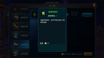 技能石有等级之分,普通技能石用于升级20级以下的角色技能。技能升级之后,才能发挥更强大的战斗力,技能效果也会更显著。