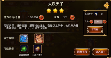 重置关卡次数可用金币购买。天子之路任务会消耗体力,体力不足时可用金币购买,购买次数每日3次;