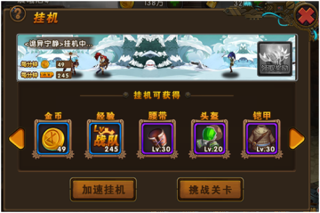 挂机可以获得大量的装备道具,有一定几率获得橙装哦~越到后面的挂机关卡,奖励产出越丰厚。