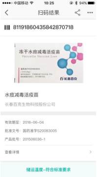 码上放心软件是针对药物的安全性进行药物条码扫描的一个平台,如:扫描一盒冻干水痘减毒活疫苗的监管码后看到,扫码结果不但显示疫苗的名称、生产厂家、有效期、批准文号、产品批号等基本信息,还能记录该疫苗是由武汉市汉南疾控中心发出,经过运输送到纱帽街卫生院的流向信息,流向过程中的每个环节同步温控结果,如果合格,则给出“温度符合储运标准”的提示。