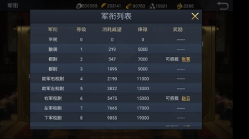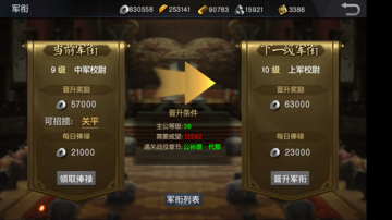 玩家们在通关董卓势力,进入国家之后,即可从主城议事厅中进入军衔界面。提高军衔需要同时达到两个条件:当前威望值及征战通关进度,缺一不可。值得注意的是,当玩家提高军衔时,是会消耗大量威望值的,所以,想要高人一等的有志之士们,就需要想办法积累威望值了。