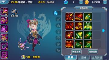 英雄界面可以进行装备查看、装备强化、批量出售,晋升,主角详情查询相关操作。